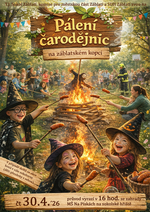 Filipojakubská noc z 30. dubna na 1. května patří k nejoblíbenějším tradicím. Naši předkové věřili, že právě v tuto noc mají zlé síly a čarodějnice největší moc. Lidé proto zapalovali ohně na kopcích, aby odehnali vše špatné a ochránili vesnici a úrodu. Postupem času se z rituálu stala veselá tradice pálení čarodějnic, která dnes patří hlavně dětem, kostýmům a dobré náladě. V Záblatí si tuto tradici připomeneme po svém. Čeká nás pálení Morany, kterou vyrobí žáci místní školy, společné přivítání jara a opékání párků. Košťata jsou vítána, létání na vlastní nebezpečí. Sraz čarodějnic v mateřské škole Na Pískách, průvodem vyrazíme v 16.00 hodin přes centrum Záblatí na sokolské hřiště. Zde děti čekají soutěže s Terezkou Workovou, skákací hrad a autíčka. Občerstvení zajištěno. V případě nepříznivého počasí se akce koná v sále sokolovny. Za děti zodpovídají rodiče. Srdečně zvou pořadatelé : Tělocvičná jednota Sokol Záblatí, komise pro městskou část Záblatí a místní sbor dobrovolných hasičů
